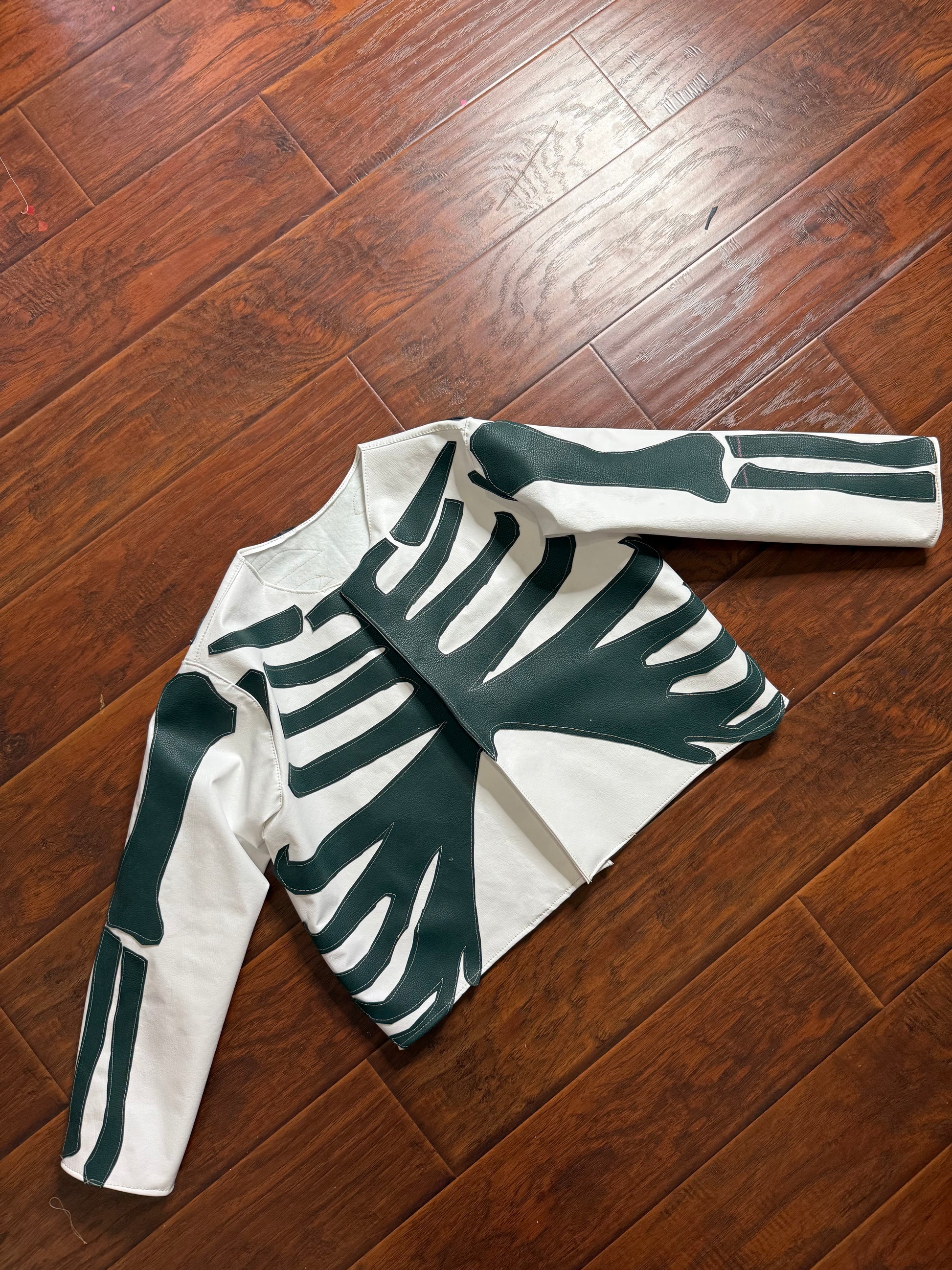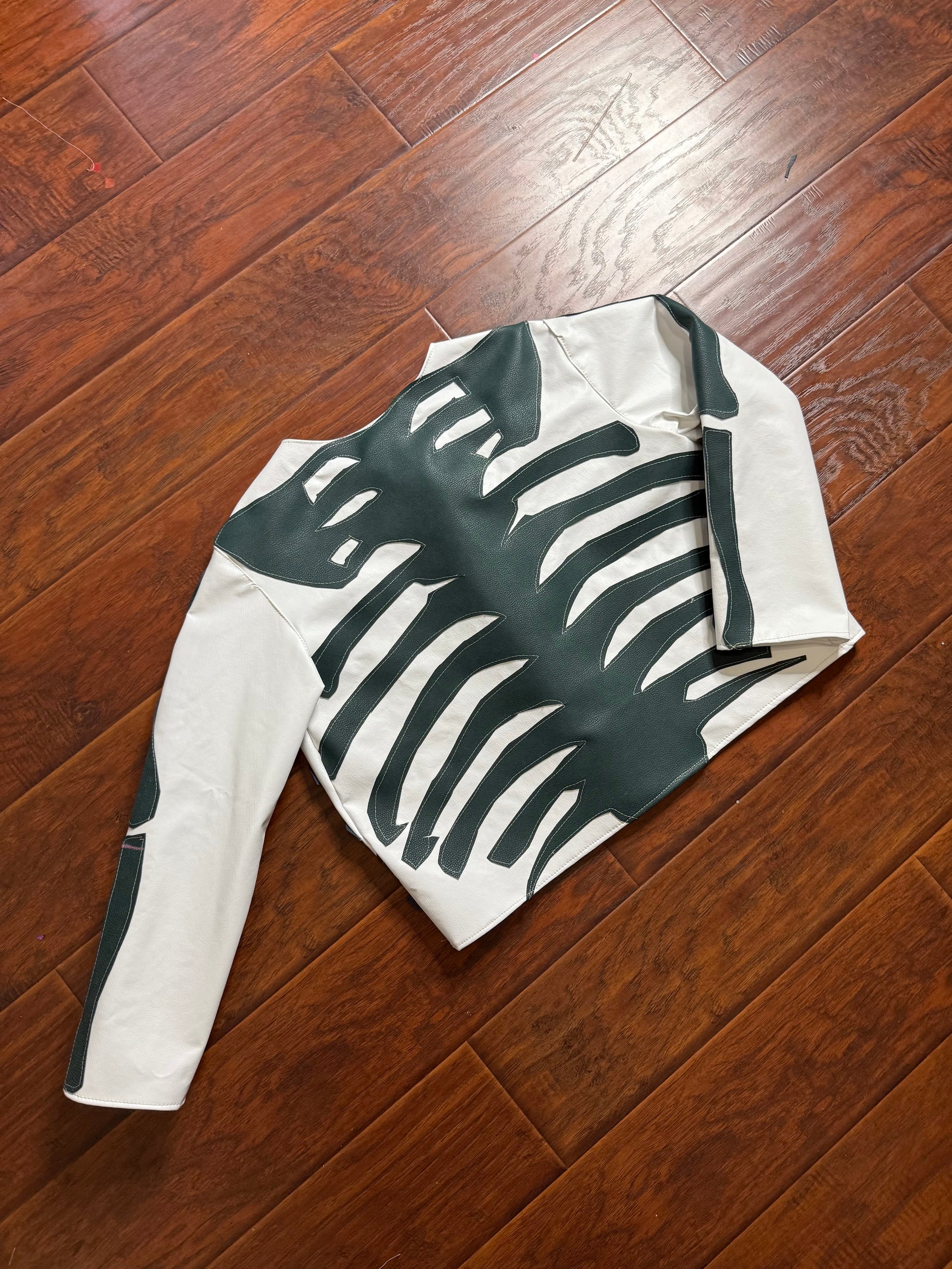 White leather racer jacket boxy fit with green pebbled leather bone skeleton details.